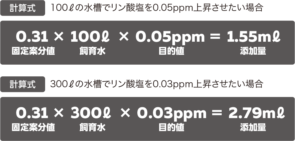 添加量は目標値により算出可能です。水質試薬で現在の飼育水の数値を把握してください。